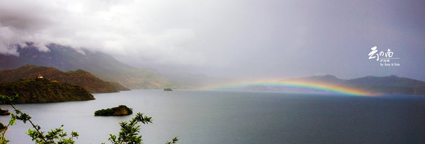 一路飞奔到我们四川段的客栈,路上巧遇了彩虹,好大一条,横跨整个湖面,车上的小伙伴都开始欢呼雀跃起来。