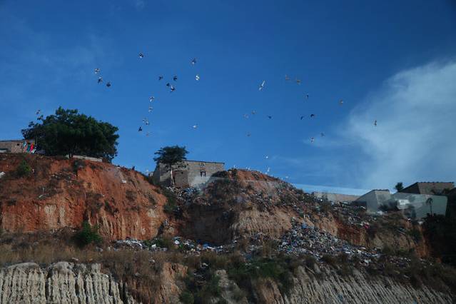 出了安哥拉罗安达机场,在车里拍的第一张照片,天空、鸟、垃圾山