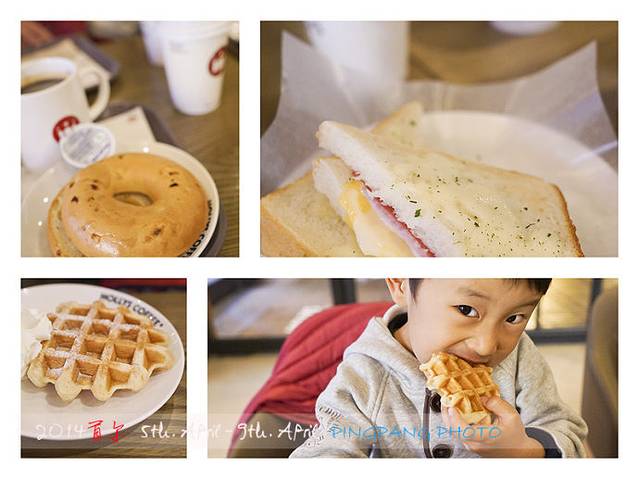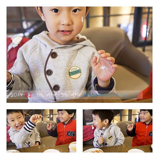 给儿子们点了鲜奶油+华夫饼,爹地妈咪则是面包圈、吐司各取所需。热饮好少啊,乓妈这种上了年纪一喝咖啡就心悸的主儿,大早上的也冒然喝了不加奶的黑咖。还好还好,咖啡不是那么苦属于清淡型的,又碰巧合了我的心意。俩孩儿边吃边玩儿,吃着吃着就下了道儿,HAPPY起来了。