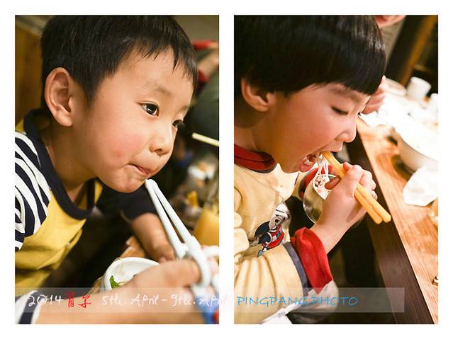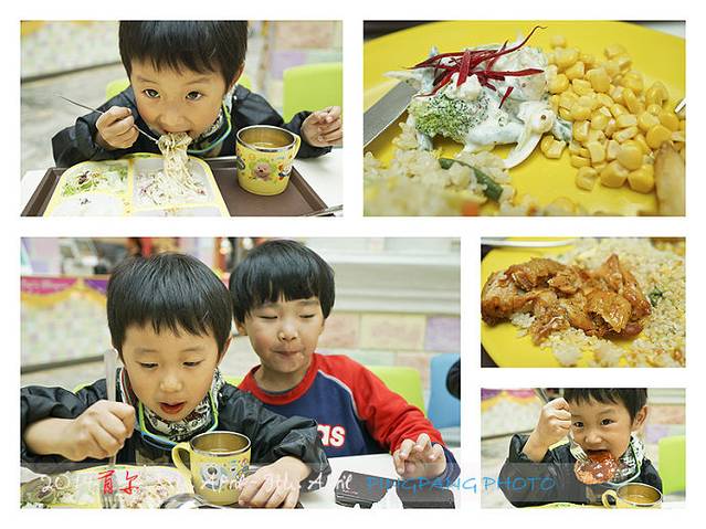 这俩小伙儿,到那儿都不认生,也基本无需多照顾,饭菜碗里一放,自己就划拉了。餐饮之间,自得其乐。最爱“做饭”游戏,什么汤汤水水、调料啊、菜啊、蛋啊,统统嚯嚯到一起——“乓游氏料理”。