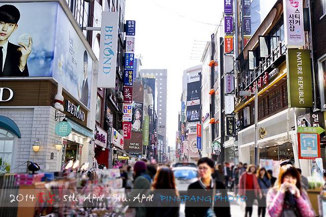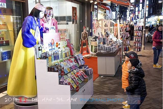酒店就在明洞地铁站4号出口,所以出门几步路就到明洞闹市区(当时选择酒店,除了考虑5花以上,还有就是这个交通和地理位置。知道亲子游重点不在SHOPPING,所以住在繁华区,溜溜达达之间就能把物购了,嘿嘿)。玲琅满目的护肤品小店比比皆是。两个孩子首先被这二位身着韩服、彬彬有礼、频频鞠躬的美女吸引