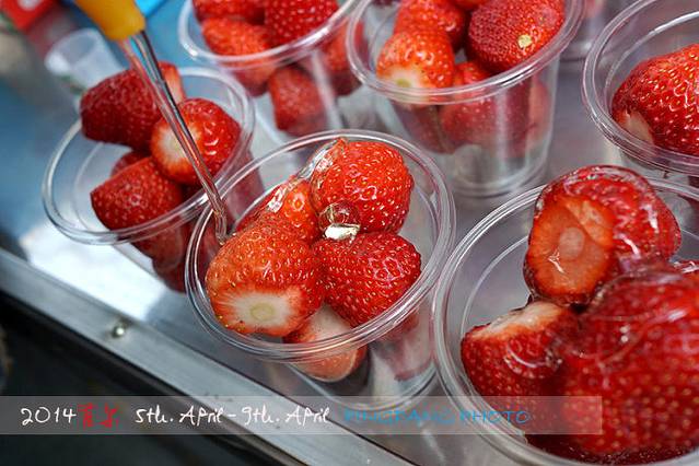 路上,首先被这新鲜草莓诱惑,可以选择浇蜂蜜或者巧克力酱。
