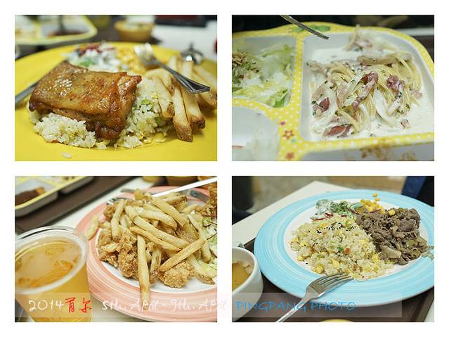 儿童餐里有蔬菜沙拉、意面、米饭、鸡肉饼、薯条和饮料,营养丰富且不失孩童的喜爱。