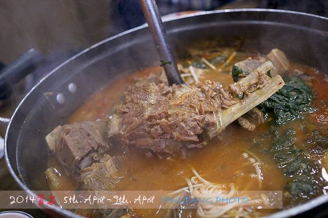 “元堂脊骨土豆汤”明洞店,没有让我们失望哦。满锅的食材仿佛要扑出来,脊骨、大块的土豆、金针菇、韭菜、白苏等炖在一起,里面还有一种口感劲道、红薯味十足的块粉超级好吃。