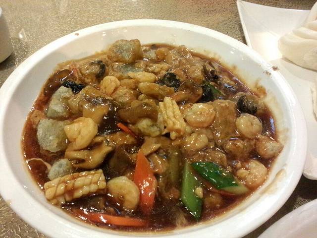 大连的美食种类很多,当属海鲜最负盛名。当地一种特色美食“焖子”,可以做成各种味道,像海鲜焖子,红烧焖子等。焖子的口感和内地的凉粉是一样的,或许就是一种东西,这里的焖子经过煎炸,表皮酥脆,内芯绵软,味道发甜。街边的小吃摊上到处都能买到焖子,这里的焖子是最原始的味道。我们来到一家经营海鲜生意的老店,点了一盘三鲜焖子,里面加入了各色的海鲜,还点了海兔等特色的海鲜产品,大饱口福。