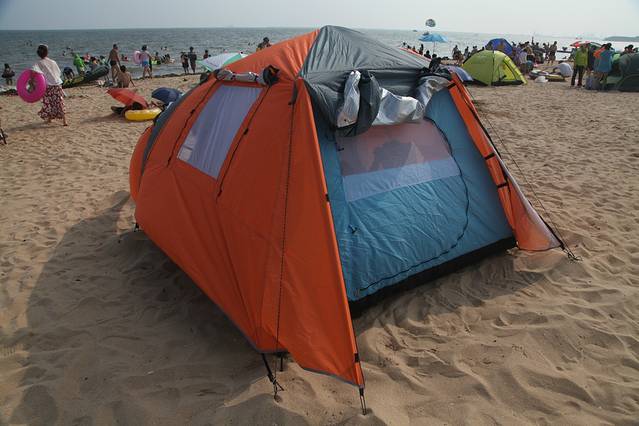 海风下搭这种大帐篷很挑战……但是钉子扎稳后,帐篷里一吹海风那是各种爽歪歪~