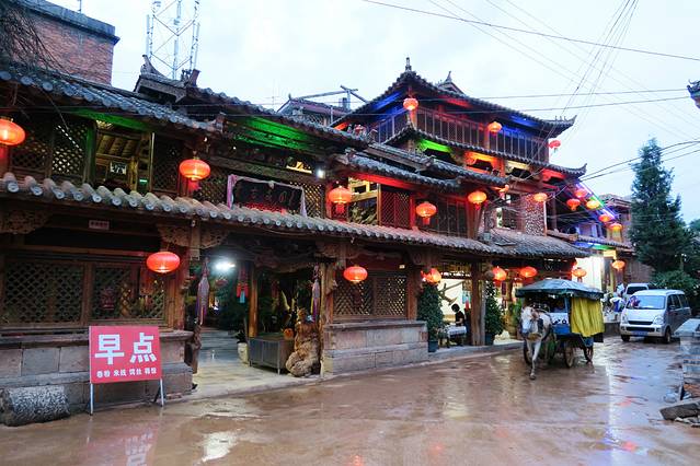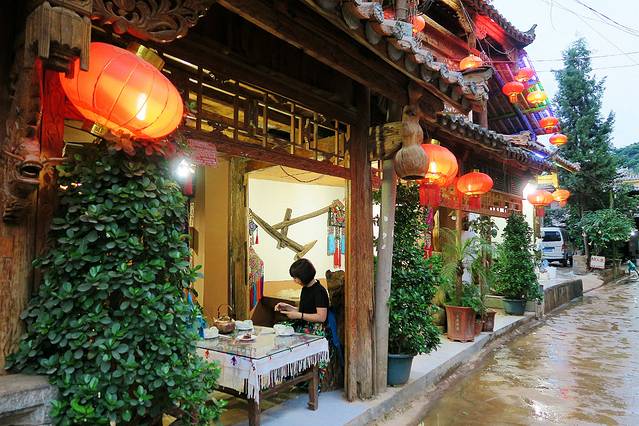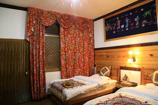 这是仙人洞村最好的客栈了,客房的床单,靠头,壁挂用了典型的彝家图案和色彩,房门则是双层,内门雕花缕空,外门双樘双开,美观而实用,“好想有个人在这滚床单哦”,源自旅友的评价。