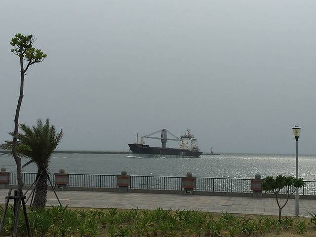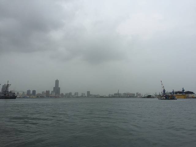 预报台风即将登陆,爱河全线封锁,风很大,湿气也重~照片中的货轮全速进港,速度非常快~