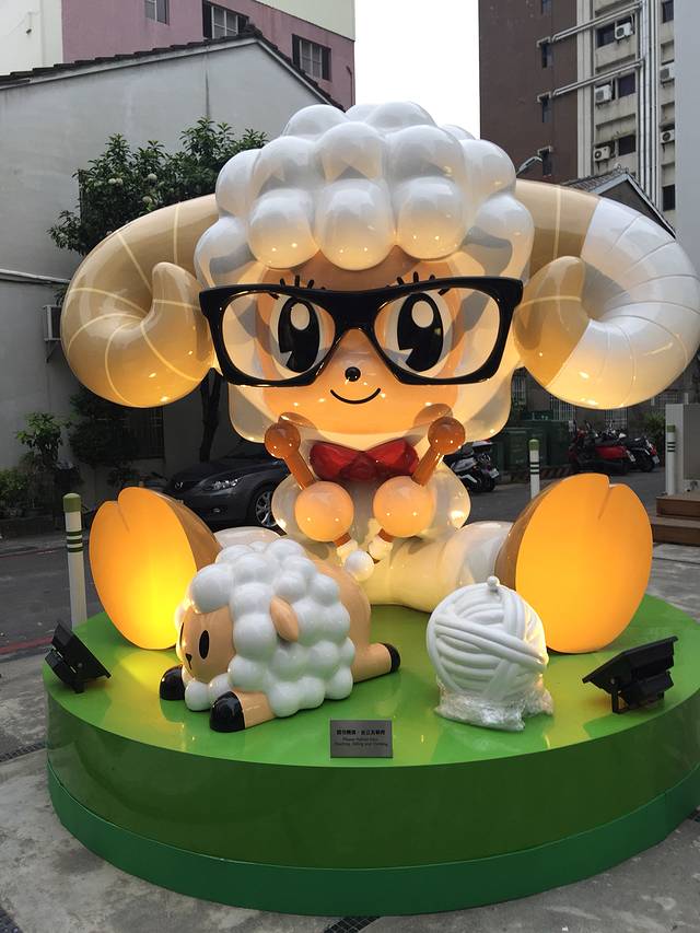 高雄夜市上的一个雕塑,是某个品牌的标志吧,看起来像我们国产的喜羊羊呀~