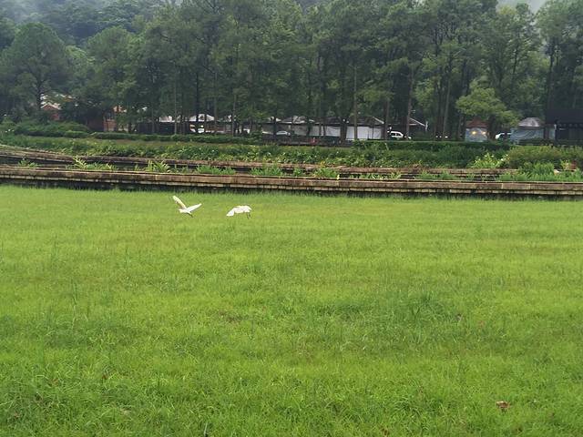 两只白色的鸟在草地上展翅飞翔,比翼双飞么~嘻嘻~