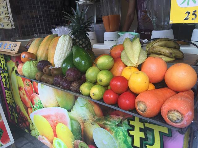 各种鲜榨果汁,我们要了一杯综合果汁,各种当季水果鲜榨而成,有芒果,凤梨,黄桃还有木瓜,很大杯,才40新台币,在国内随便一个鲜榨西瓜汁都得二三十,所以到台湾一定要多吃水果,多喝果汁~