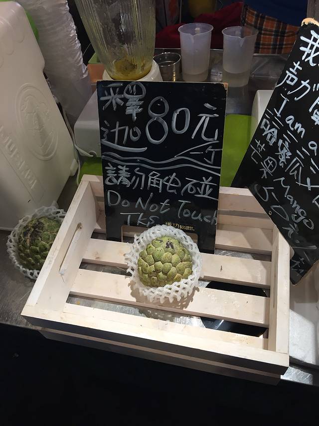 释迦,是一种水果,像不像释迦摩尼的头啊~牌牌上还写着请勿触摸,好搞笑呀~这个水果味道甜甜的,口感软软的,有点像榴莲的口感,用勺子舀着吃的,就是里面籽有点多哦~