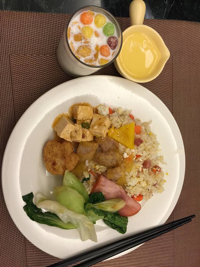 自助早餐,拿了炒饭,麻婆豆腐,火腿和青菜。旁边那个五颜六色的是牛奶,牛奶里面放了好多果果,好看又好喝。黄色的那个是布丁,吃完饭,来一个甜品,心情极好的。