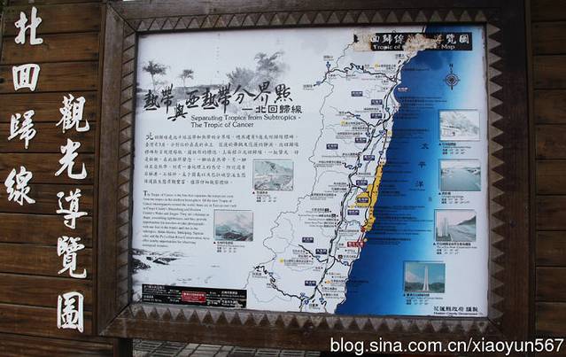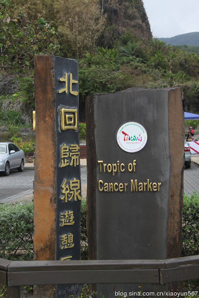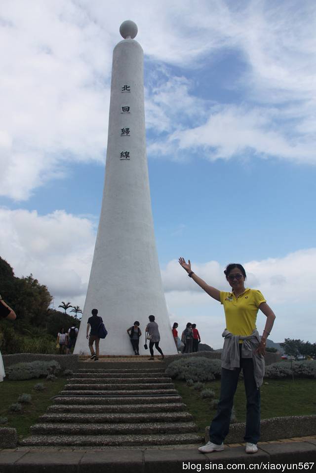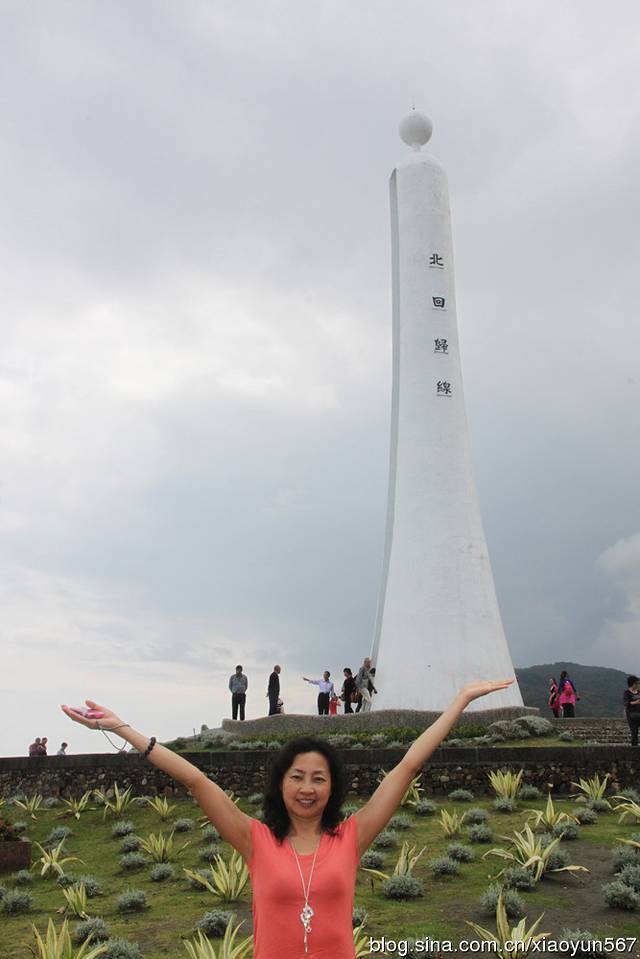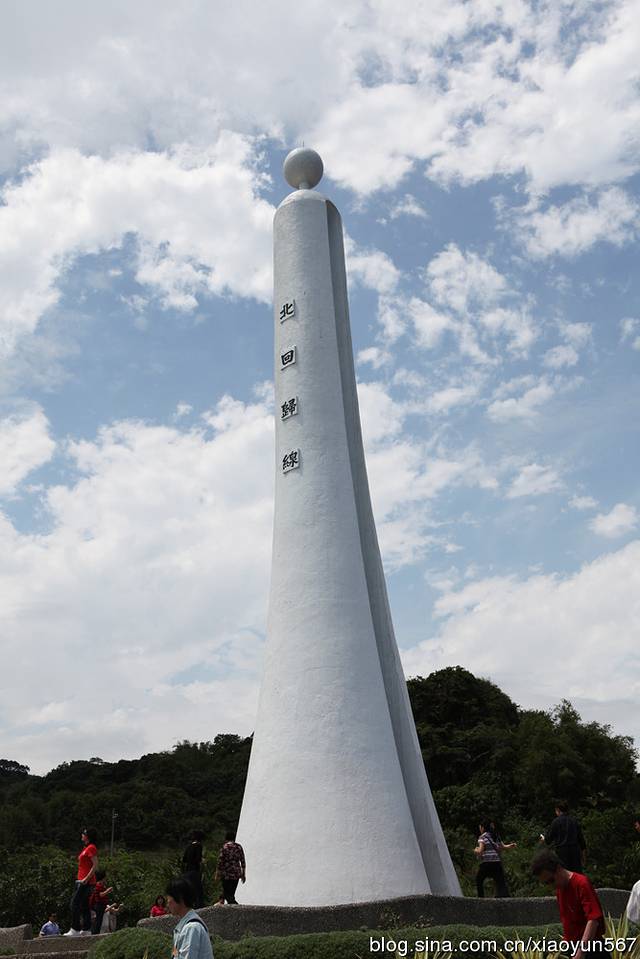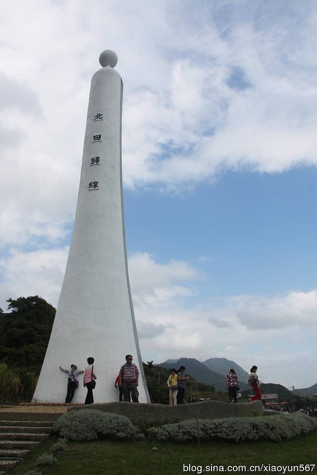 静浦北回归线标志塔位于花莲县丰滨乡静浦村的北回归线标志塔,东临太平洋,圆柱形,灯塔状,一柱擎天,颇为壮观。标志塔的南北两面,上刻“北回归线”字样,圆柱中间有纵向狭长细缝,北回归线正从这里通过。每年夏至(6月22日左右)这一天正午11时54分,太阳光从上面垂直照射,在这一刹那,就能看到“立竿不见影”的天文现象。也正是从这一瞬开始,北半球进入夏季。当你两脚跨踏塔底中央的石板时,就是一脚在热带,另一脚则在亚热带(北温带),别有一番地理上的感受。我们此次参观的就是静浦北回归线标志塔。(以后有时间我会介绍我国现在已建有10座北回归线标志塔。)