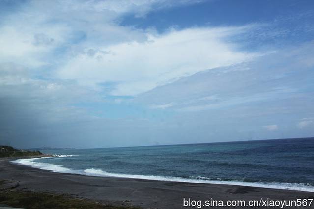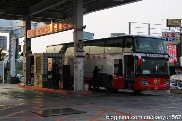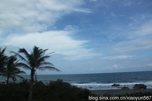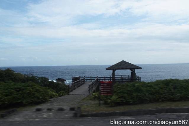 这就是我们的大巴,台湾的旅游大巴都是看似双层车的那种底层是行李舱,上面才是坐人的。我们一行29人的团,这台车看似超过了40个位子,很宽敞,在来台湾之前,就听说这里的旅游大巴很不错,比我们平时见到的金龙什么的都要高级,其实倒不是说车多好,就是装潢的不错。由于我们好象是坐在二层上,车子摇摆很厉害,我还真有点晕车,尤其是去阿里山路上,为此还吃了好几次的晕车药。几天来大巴载着我们绕着台湾转了一圈。沿路上有很多的好风景,尤其是台湾东部的海岸风景是大陆没有的,真的很漂亮。车身的外边是一望无际、波涛汹涌的太平洋,我在车上透过车窗拍下了很多太平洋的美景。