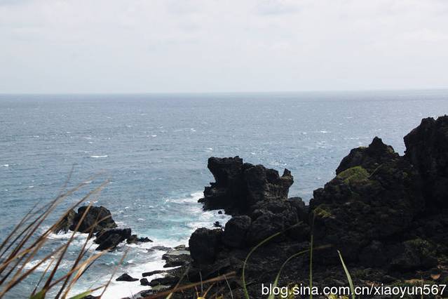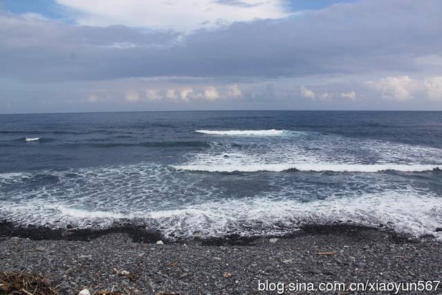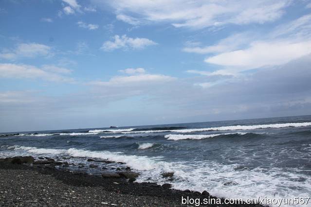 看见海滩上的石头,黑色的部分是海浪打过的痕迹,我俩听导游的话,站在干的石头上留影,我们团的团友就站在黑色石头上照相,当你感觉大海风平浪静时,不知危险已临近,一瞬间大风卷着海浪就把他们的裤子和鞋全打湿了。