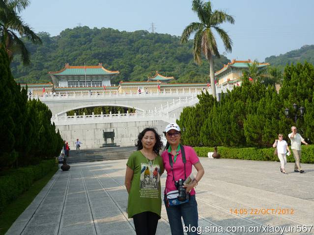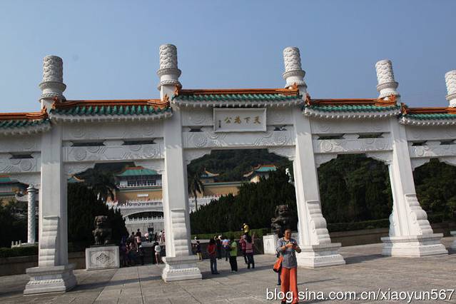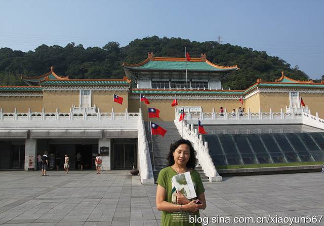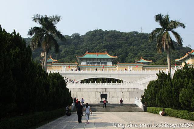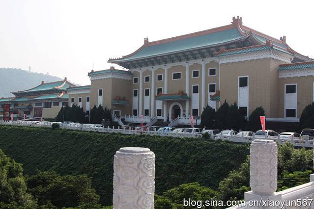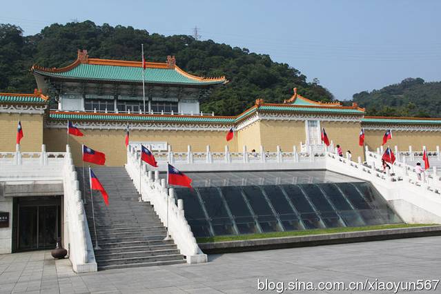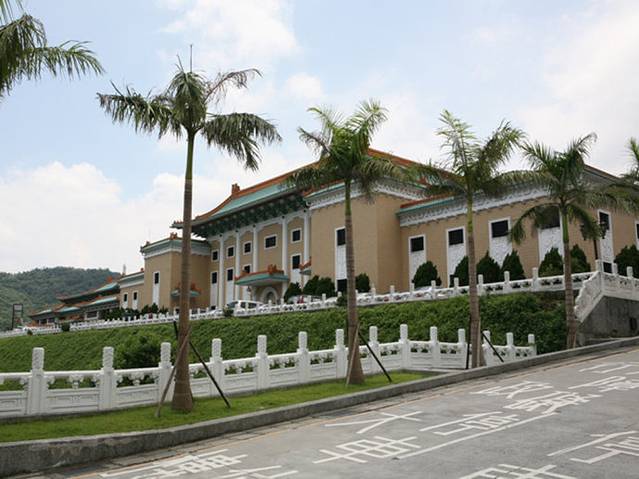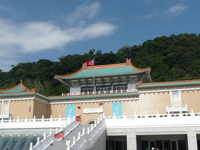 台北故宫博物院是中国著名的历史与文化艺术史博物馆。坐落在台北市基隆同北岸士林镇外双溪,始建于1962年,1965年落成。占地总面积约16公顷,依山傍水,气势宏伟,碧瓦黄墙,充满了中国传统的宫殿色彩。第一层分别是讲演、办公室、图书馆;第二层是展览室、大厅及画廊,用来展示书画,四周共有8间展览室,陈列铜器、瓷器及侯家庄墓园模型及墓中出土文物;第三层陈列书画、图书、文献、碑帖以及玉器、珐琅器、雕刻和织绣等;第四层为各种专题研究室。巧妙的是;第三层楼后面架了一座长廊天桥,直插人后山之腹,原来是一个深180米、高6米、宽3.6米的山洞,洞内分为一个个小室分类收藏文物,全部设有空气调节系统、防潮系统、防火系统和防盗系统。