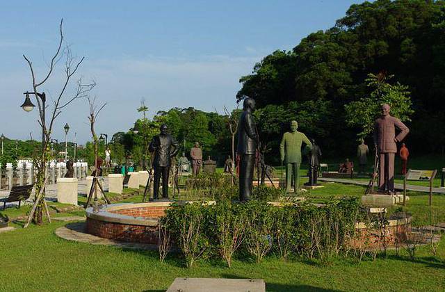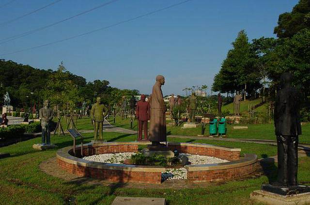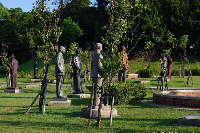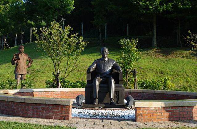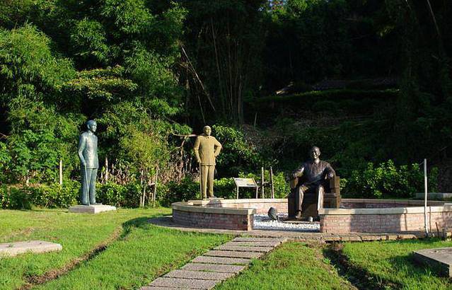 上世纪90年代后期,国民党在竞选中失败下野,政党轮替,民进党上台执政。当政的陈水扁曾经身受国民党迫害,于是推行“去蒋化”,蒋介石实行白色恐怖成为舆论反思的对象,各地矗立的铜像纷纷拆除,面临回炉炼铜的命运。慈湖所在的桃园县系蓝营执政,于是将各地拆除的铜像收来,据说有两千多座,选出其中艺术水准较高者,建成这座雕像公园。当时,被讥笑为“铜像收容所”。现在,却成了一处游人如织的景点。雕像七、八十来个一组,蒋介石和蒋介石相视而立。最大的一尊钢制坐像来自高雄,搬迁时分解为117块,艺术家刻意用不完整的方式组合重建,取名为“伤痕与再生”,意在记取历史的伤痕与教训,走向族群融合的重生。