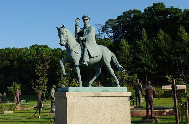 一个人的多座塑像安放在同一公园,当属台湾特有的艺术奇观。其实,这一百多尊铜像并不是为一个公园而塑,而是在上世纪50到70年代散立于台湾各地。蒋介石自从上世纪二十年代末登上中国政治舞台的中心位置,一直想实行一个政党、一个领袖、一个主义。但早期对别人给自己塑像的态度还比较慎重。1945年8月,抗日战争胜利,蒋介石作为同盟国美、苏、英、中四强领导人之一,声望如日中天。当时重庆市参议会提出:“主席蒋公领导抗战劳苦功高”,提请市政府为蒋介石塑像,以资隆重纪念。随后,市参议会经与市工务局商议,正式确定四项:一是在都邮街广场塑蒋介石全身铜像,二是在佛图关建抗战纪功碑,三是将南岸黄山改为“中正山”,四是在朝天门建筑两江大铁桥。蒋介石对此逐一批示,对在都邮街塑铜像一事,他批示“不可行”;对在佛图关建纪功碑一事,他批示“可办”;对将黄山改为“中正山”,他批示“不必”;对建筑两江铁桥一事,他批示“以林森命名为宜”。