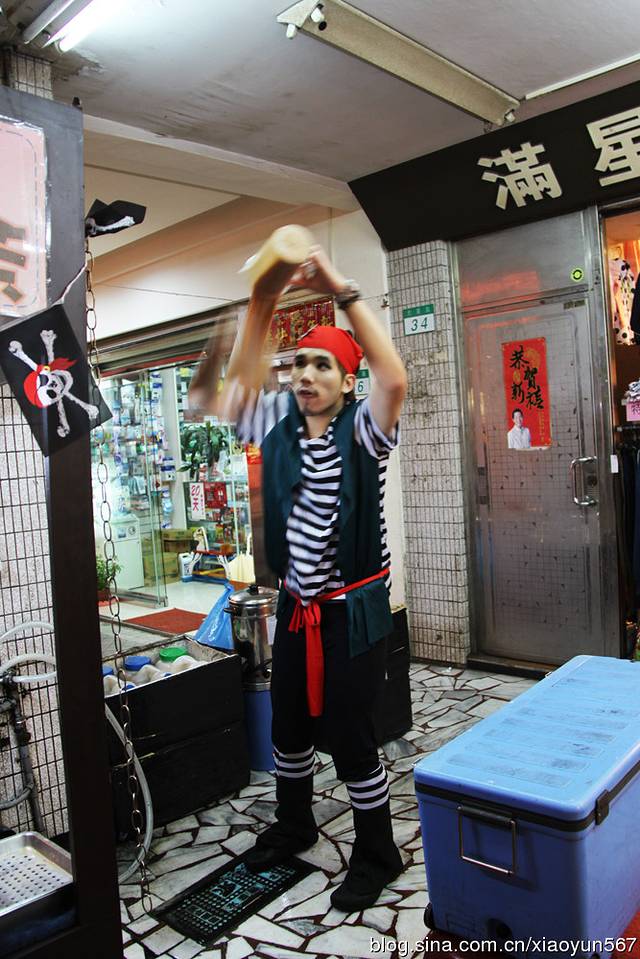 这小伙子耍的是什么茶,我还真忘了,他把各种东西放在杯子里,上下翻滚,穿着象海盗似的,我冲着他的表演买了杯,50台币。