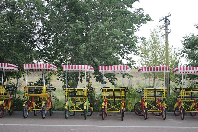 可以租自行车。个人觉得风太大,还是观光车比较好一点。