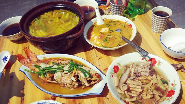 进庆源村要收20/人的公共管理费,庆源村其实很小,却是有小桃源之美誉,确实非常值得一去!一下车被【桥头饭店】的老板拉去他家吃饭,开始有点习惯性的反感,但是马上发现老板全家都非常淳朴,而且在阳台上的景致完全惊艳,想象如果是有晨雾的话,简直就是仙境!我们还提出要在阳台上摆饭,老板也非常配合,点了荷包红鲤鱼48元、土鸡100元、腊肉炒水芹20几、排骨竹笋30几、番茄蛋汤10几,味道很赞,一餐一共220元,吃得非常满足!