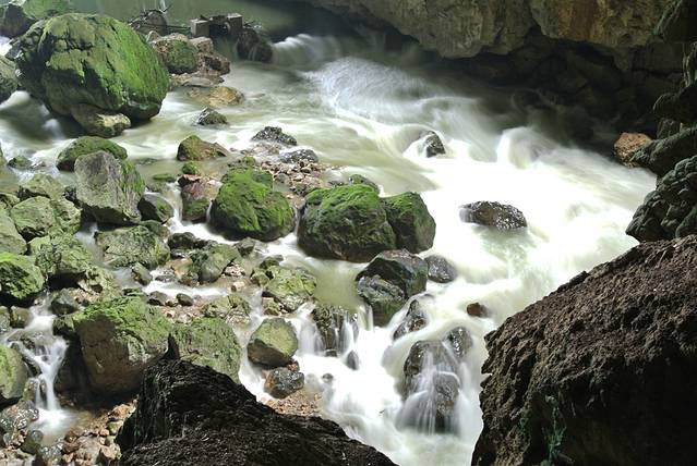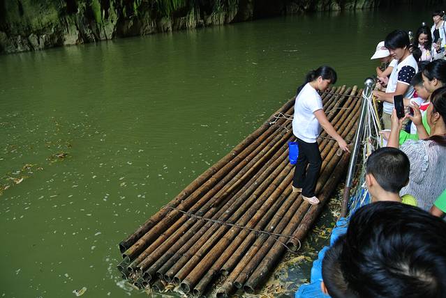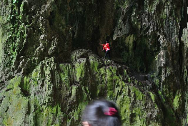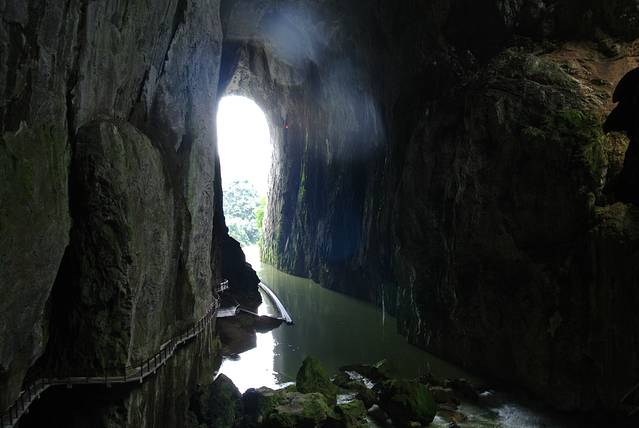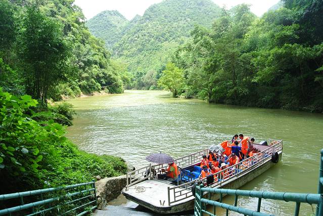 看点:我个人觉得格凸河最大的看点便是其奇形怪状的“岩石”,由于整个贵州大部地区都是喀斯特地貌,所以有比较多的溶洞之类的景点,例如黄果树瀑布的溶洞,织金洞等等。一面享受着崇山峻岭、层峦叠嶂的美景,一边抱着美人,把“爱江山、更爱美人”的这段佳话释放的淋漓尽致。在燕子洞中,天然形成的“假山石”(我不知道怎么形容这个石头的样子,但形似假山,索性就叫他假山石吧),被“蜘蛛人”(当地以徒手登山的“卖艺人”)花了约莫不到10分钟的时间便登上了108米高的山顶,当蜘蛛人到达山顶并向大家挥手致意的时候,山下响起了一片又一片的叫好声和掌声。我肯定是不敢去攀登如此高的山脊,更何况“蜘蛛人”没有任何保护设备。而且我们有幸看到了这一带唯一一位女性蜘蛛人。我也顺便“采访”了一下蜘蛛人曾经在练习攀岩的时候是否有跌下来过(看到这里很多人会说,跌下来你还看得到蜘蛛人吗?其实我们自己也看过,由于岩石基本上是垂直的,所以我猜想如果一旦跌落下来的话,会直接落入13米左右的河水中,并不一定会有生命危险)。看罢蜘蛛人的惊险表演后,开始我和她的“艰难”旅程,因为一直到观景台会有无数45°以上的台阶正等着我们一步一步的攀登,我自己估算了一下,从浮桥(看蜘蛛人攀岩的地方)到燕子洞顶,再到观光电梯顶部,至少约么200米的落差。进入燕子洞后,我惊讶的发现我们将要行走的“楼梯”竟然是“镶嵌”在厚厚的岩石上的,左面悬空,右面嵌入岩石壁中,每一步踏在台阶上都会令人“惊心动魄”。(提示:在攀登的时候要格外注意,尤其是阴雨天气,潮气重,雨水飞溅在青石板上甚是湿滑,建议穿一双轻便防滑的鞋履。)