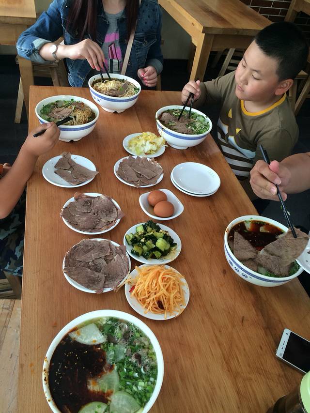 这家店的特色浆水面,味道很特别,有点带酸,夏天吃清热解暑。尧尧和嘟嘟啃完猪蹄直接没取手套吃起了手抓面