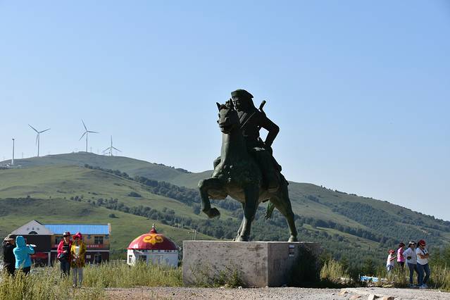 在此拍照合影的游人很多,凝神驻足间我将这尊雕塑名之为:看护者。千里草原,茫茫无有劲头,一位蒙古族勇士昂首汉蒙分界线,时空在这里定格,勇士永远止步不前。背后是牛羊满地的大草原,眼前是一马平川的汉家天地。没有了劫掠杀戮,攻城克地,有的是中华民族大团结的一派歌舞升平。