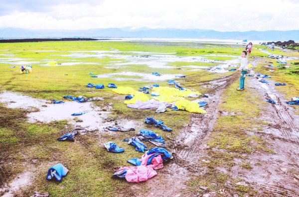 我拎着鞋光着脚穿过一片泥泞地,去坐船。