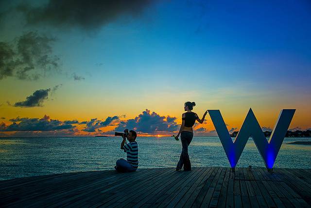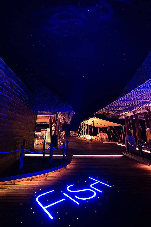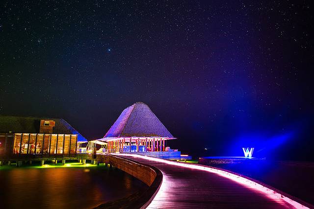 岛上有三个餐厅,一个是KITCHEN,坐落在岛中央的位置,每天的早餐都在这里用,户外的餐桌设计很别致,脚下直接可以触摸到凉爽的水流,给用餐体验增加了乐趣。另外一个是FIRE,海滩自助烧烤餐厅,晚餐时间和KITCHEN隔一天开放一次。最后一个餐厅FISH是在观海落日区附近,灯光设计得无比炫目,脚下的蓝色小灯和天空上的星星遥相呼应。在如此绝色美景中,把一颗心完完整整空出来,只让你的那个TA住进来,把一个胃完完整整空出来,只让美食住进来。在FIRE餐厅,我们花了364美元,享用了人生最贵一顿自助餐,MD还是心甘情愿的。在FISH餐厅,我们吃到了有生之年最大最新鲜的扇贝。在W岛的三个餐厅中用餐后,你会发现这里没有所谓严格划分中餐和西餐,而是新世界料理和新亚洲料理,各种世界级的食材和料理手法在这里融合得非常NICE。