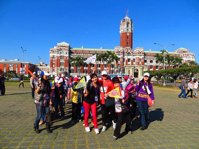 台湾的总统府是对外开放的,为了表示亲民,把原本的一些防爆设施弄得隐蔽了起来。检查有无危险用品的X光机,也移到侧边,除非太大件的包包才要检查,原来是要营造友善、温馨的总统府,让民众更方便亲近。无论如何,有这样的姿态还是很不错的。我们只看了外观。台湾人挺友好,几个带了小朋友的老师,看见我们要拍照,比孩子还积极,做出泡斯让我拍照。