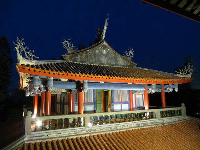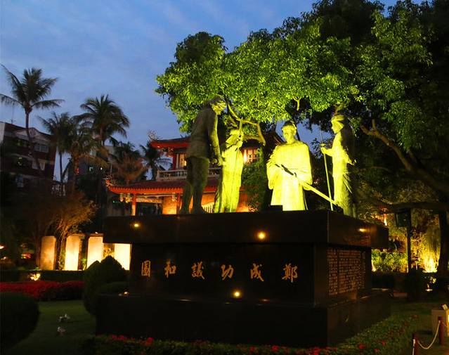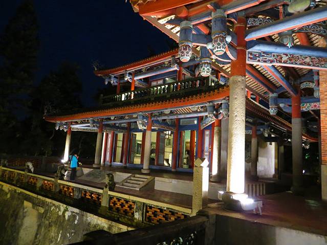 从阿里山下来,车子就直奔高雄。经过台南市去了赤坎楼。此时天已经黑透了,景点都亮起了灯。我们登楼参观这个荷兰人所建的一座具有防卫功能的普罗民遮城(赤坎楼)。郑成功登台赶走荷兰人,进驻普罗民遮城,设置承天府于赤坎楼。后因郑成功迁移至安平热兰遮城(安平古堡),普罗民遮城被当成放置军火库使用,一直到清朝将台湾纳入版图为止。