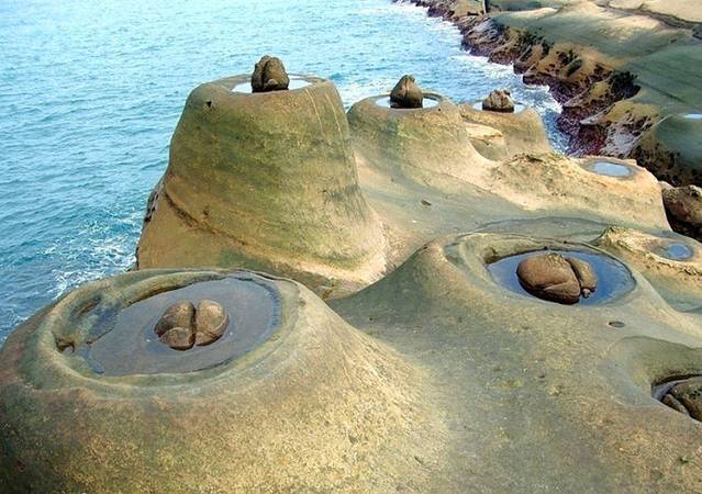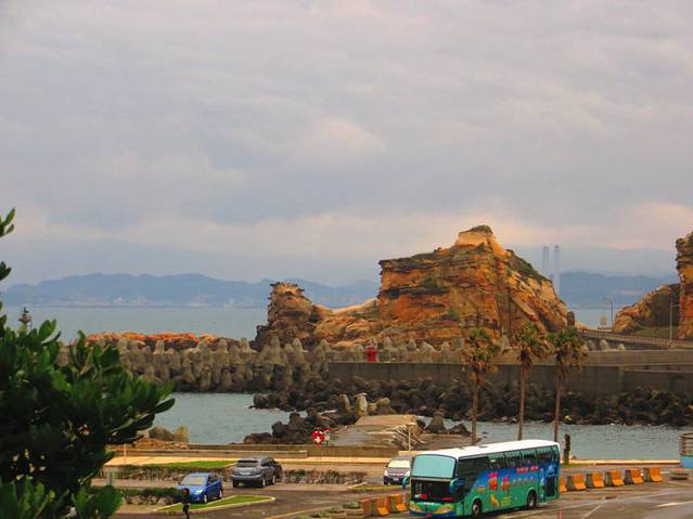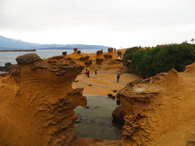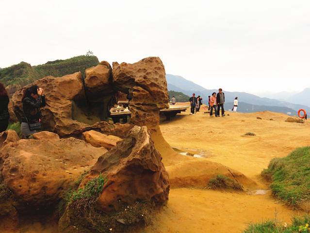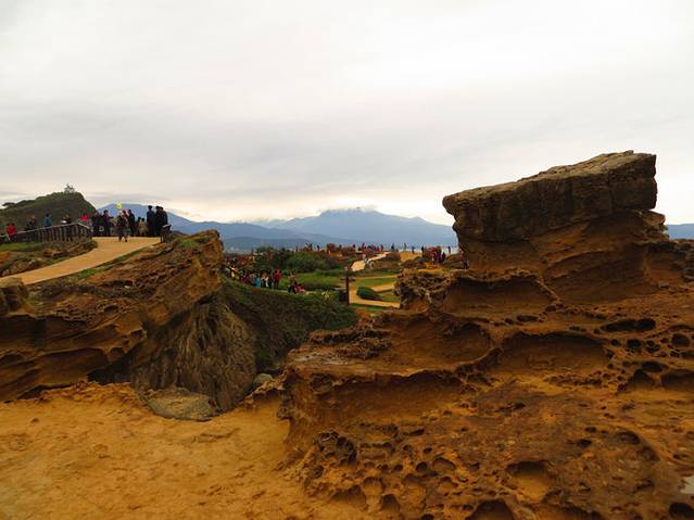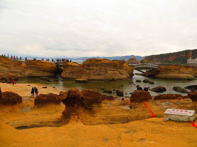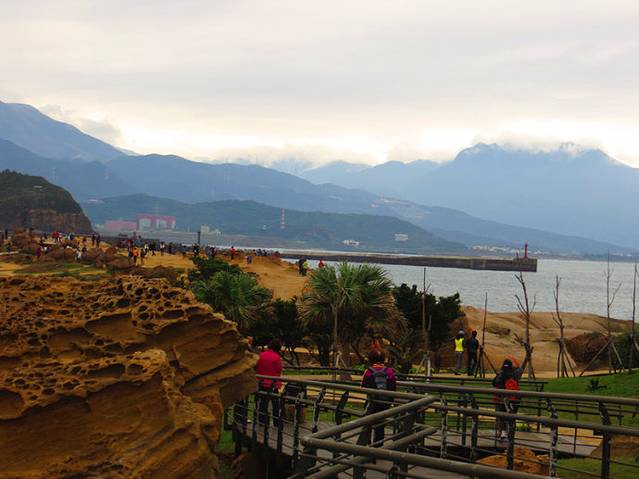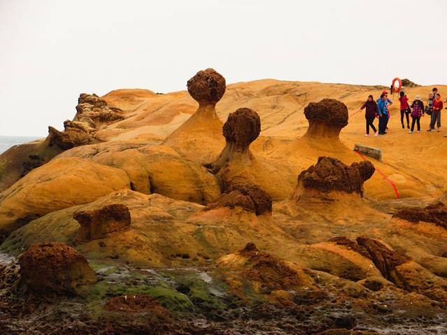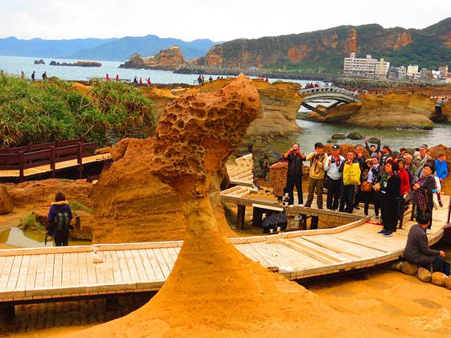 下午,我们来到野柳公园。它是位于新北市万里区著名的地质公园。万里乡为突出于北海岸的狭长海岬,经千百万年的侵蚀、风化的交互作用,逐渐形成蕈状石、烛台石、姜石、壶穴、棋盘石、海蚀洞等地质奇观,让全长1700米的海岬,成为台湾最负盛名的地质公园。