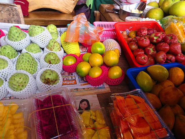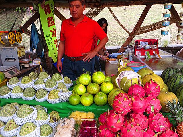 第二天我们沿着太平洋向北去花莲。沿途风景旖旎,海天美景尽情展现。在一个水往上流的参观点,虽然看起来水似乎真是向上流去,但是因为明白是一种错觉也就不新鲜了。倒是这里的风景很美,真是鸟语花香。水果种类多还便宜。尤其是释迦,真是甜得很。红心的火龙果我也是头一次见,还有莲雾红红的,又脆又甜。