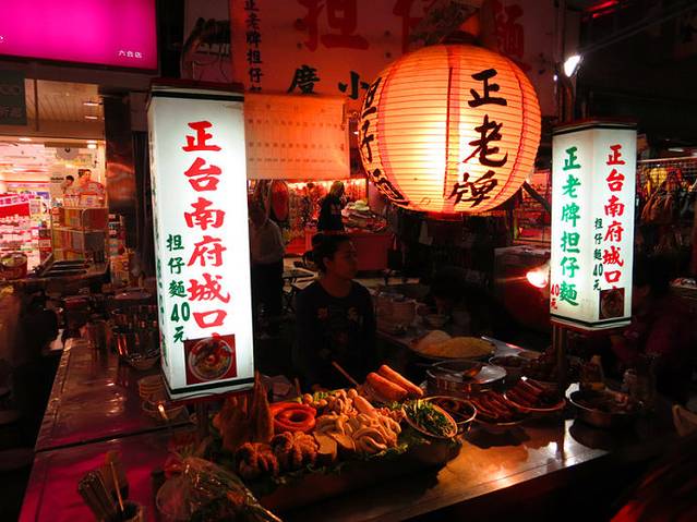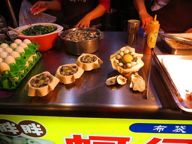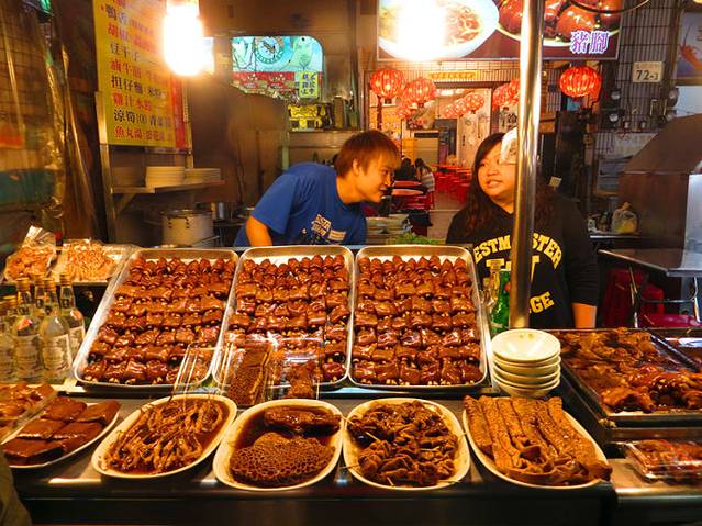 台湾的小吃很有名。如果追溯其来源就要到郑成功时代了。当年,台湾荒芜,郑成功的父亲让内地人来耕种,也就带来了内地的许多食品的烹饪方法。后来日本人带来日本食品,世界各地的船员也把各国的小吃带来台湾,更有1949年以后,来自大陆各个省市的人也把自己喜欢的家乡小吃奉献给台湾,所以台湾的小吃包罗了各地各国的风味,在加上有心人的改进,才构成了举世闻名的台湾小吃。只可惜,我们吃过晚饭,眼馋肚子饱,只能饱饱眼福了。