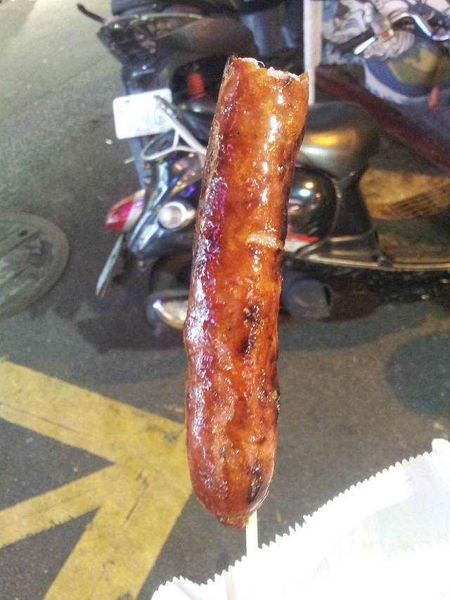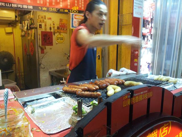 推荐西门町小吃街的山猪肉香肠(35元新台币),老板也十分风趣,一边烤肉一边跟我开玩笑。