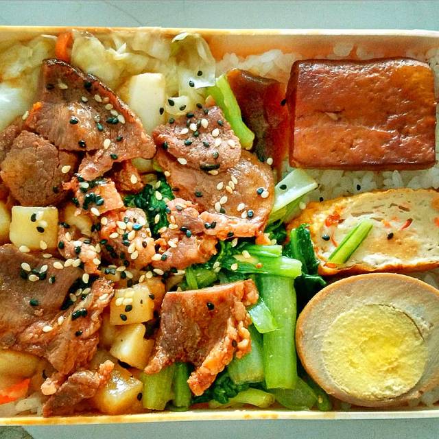 虾卷便当,感觉还是前一天的烤肉便当好吃,不过右上角的蜜糖地瓜很好吃哟!~