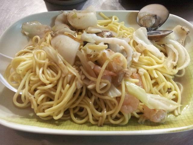 五份海鲜炒面、炒青菜、炒膳片、猪肝汤、炒鱿鱼