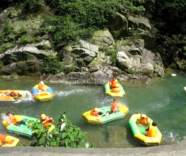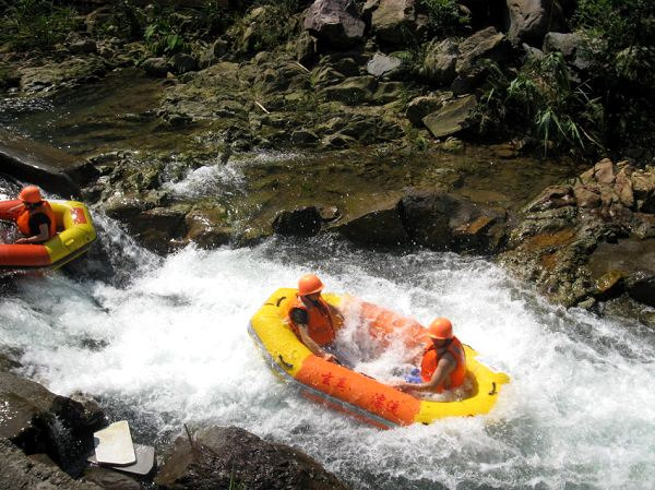 11:30进行的漂流,排队还算顺利,坐上中巴庆幸有位置坐,大多数人都是站着,不过一路狂飙4分钟就达到目的地,穿上救生衣,戴上安全帽,下船,对于初玩着来说比较新鲜刺激,尤其是刚坐上皮筏船的第一个落差,耳朵进水,皮筏船撞来撞去,心里有些小忐忑,感觉整个人都不好了。