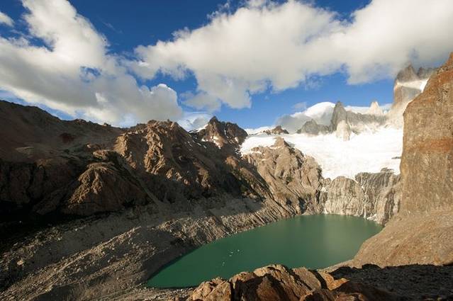 好不容爬到山顶,必须在这儿待够时间才行。山脚下这湖的名字叫laguna de las tres,此前有游记里写叫“小三湖”,确实这有3个湖。我先绕着湖向右走,从不同角度看Fitz Roy。之后走下去到湖边,尝了尝湖水,太清澈,有些甜味,特别纯净,真是这辈子到现在喝过最好喝的水!依云靠边站吧!