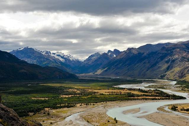 等租完帐篷、防潮垫、睡袋等等也就快6点半了,心想要明早登顶的话,那今晚必须得走到Poincenot露营地才行。按常走的路线肯定来不及。如果从Chalten镇子上的入口进山,要一路上坡,经过Rio de las vueltas观景台(一个大风口)到Capri湖再去Poincenot露营地那我天黑都到不了,而且得累死。看了看地图,决定在镇子上打车绕道后山,在El Pilar酒店下车,沿着白河(Rio Blanco)一路上山,经白石冰川(Piedras Blancas)到Poincenot。这样走起码能快1个多小时。
