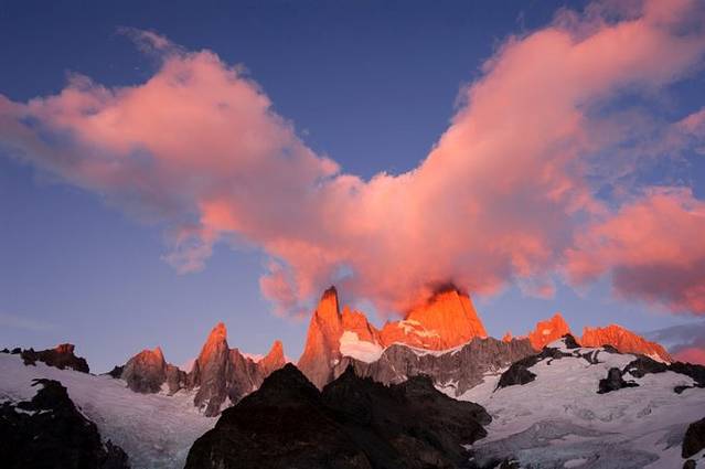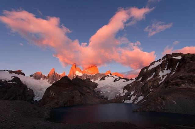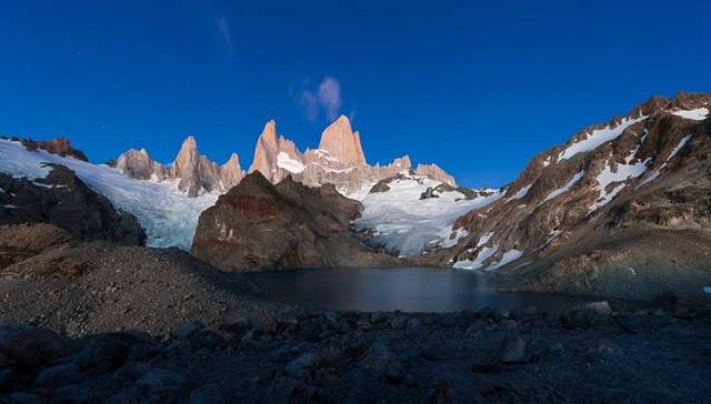 跟我们一块儿出发还有一拨人,他们走在前边,腿脚很灵,像是经常玩户外的,我们就跟着他们的脚步,一路前进。开始爬山之后,差距就出来了。这些爬山队员嗖嗖就消失了,我们速度虽说也不慢,但那么陡的坡,好多碎石子,还是抹黑走,一会儿功夫就被那些专业人士给甩开了。不过反正上山就这一条路,走也走不丢。晚上天空很干净,银河斜挂在天上,很亮。在营地的时候因为林子太密根本看不到多少天空,现在能看到了,有没机会拍,真是抓心的难受!爬了1个多小时终于到顶了,天际也微微开始变色,黑色变成深蓝,蓝色再越来越淡,越来越亮。那天山顶风很大,Fitz Roy 的山尖开始还一览无余,不一会儿就开始逐渐开始积云,先是飘过去一片很薄很白的云在山尖附近,像是吐烟圈,再后来云就多了起来,行程一个很有意思的裤衩形状。大概6点半左右,太阳从地平线升了起来。站在山顶,一侧是山峰,一侧是一览无遗的山谷和湖泊,哪边风景都很好。太阳不断地往上升,我也不停地看着Fitz Roy景致的变化,但始终未看到金山出现。大家开始相互照相留影。我在给Sergio拍的时候,瞬间山尖出现一丝淡红色,我激动了,冲着Segio喊:“日照金山啦!”然后赶快帮他拍了几张,让他帮我拍了几张之后,就拿上相机开始拍摄此行一直期待的一幕。大家在山顶上看着此番景色,都震惊了,赞叹声、尖叫声不断。虽然Fitz Roy羞涩地用一些云挡住了山尖,而且风很大,湖面也不平静,看倒影也不现实。但这种范儿的Fitz Roy也不是谁都能看见的!