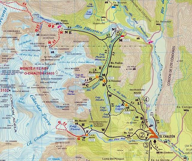 图上看1标注的地方就是Chalten镇子上的进山口,在镇子的北部尽头。从1进去,常规线路是看蜿蜒河谷(Valle de los rios de la vuelta),就是字母B左上方照相机的位置,之后再爬坡道Capri湖。这段路在纯走路的正常情况下1~1.5小时可到达,如果拍照的话就不好说了。这段路坡度上升很快,对于进山者来说很累。过了Capri湖再往前走到Poincenot这段路难度不大,平路居多,很好走。总之整个公园内徒步的路况都还不错,不算难走,除了laguna de las tres登顶那段碎石子路简直要命。如果要去Laguna Torre,镇子上有清楚的标示该往哪边走进山,就是地图上标着2的地方。