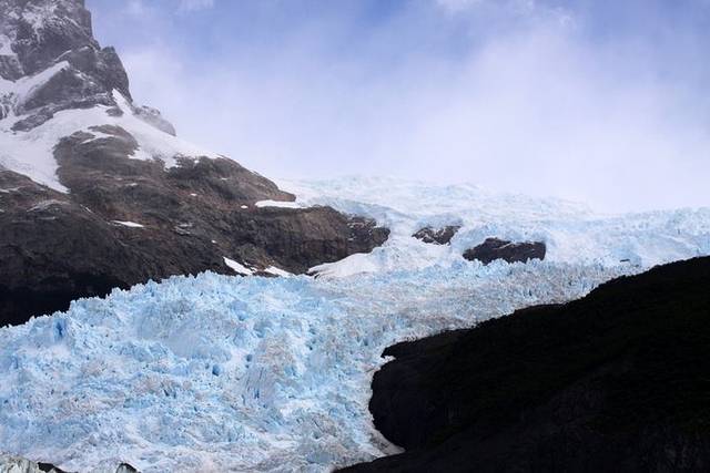 大概走了1个小时,走到一个高处,右手边没有树木遮挡,离着山没多远,大冰川蜿蜒而下,很壮观,看看地图发现这是一景点,叫白石冰川(Piedras Blancas)。根本没时间掏相机,全放登山包里了,就只能拿手机咔嚓一张,看了一小会儿,就走了。