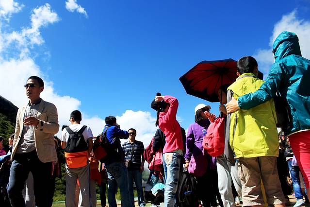 五彩池很小,人巨多,于是我们溜了一圈就走了,去五彩池站坐车下行到达诺日朗中心站,这个站是中转站不管要右上还是下行都要先到这里,我们到诺日朗中心站后找到右上的车直接坐到箭竹海下车