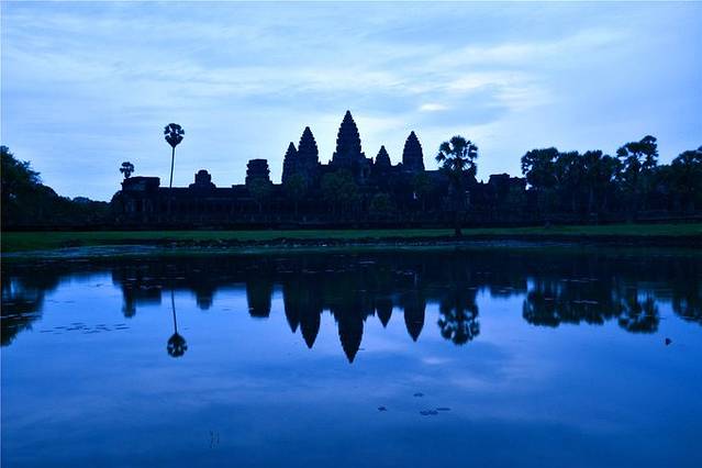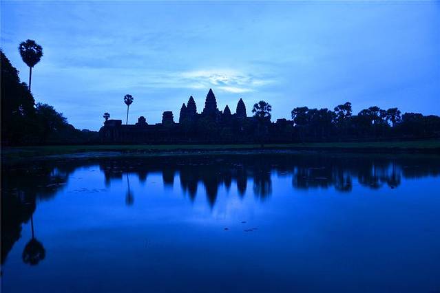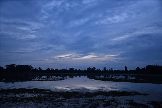 小吴哥里没有灯,要带好手电或者开启手机上的手电筒,并且要当心坑和台阶。第一次去不认识路也没关系,跟着前方的大部队走,大约十分钟可以到达荷花池边。架好三脚架开始等待日出~