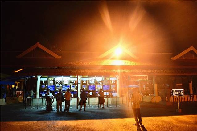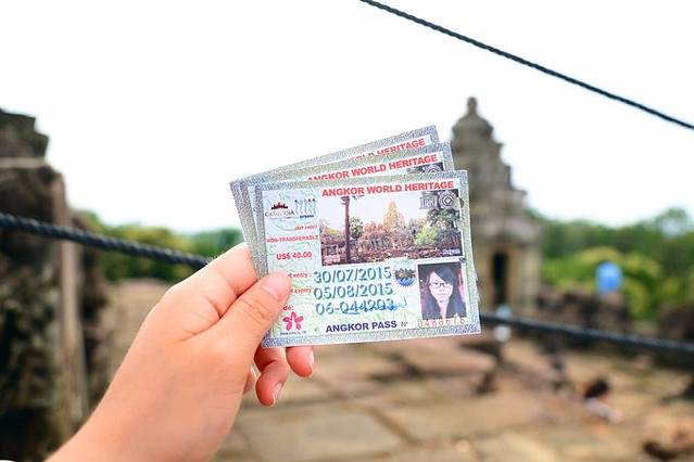 去小吴哥看日出的话,当天早上买票也是来得及的,最好4点50之前到达售票处。牌子上写5点开始卖票,实际上4点50工作人员开始进行准备,准备完便开窗售卖。每个窗口只卖一种门票(20美元一天;40美元三天;60美元七天),按照窗口外的工作人员的指示拍照、付钱,等一分钟就可以拿到。在摄像头前站定了之后便要一直做好表情,因为不知道她什么时候会按下快门。还有售票处写着每天下午五点开始卖第二天的门票,买完就可以进去游览,实际有效期从第二天开始计算。