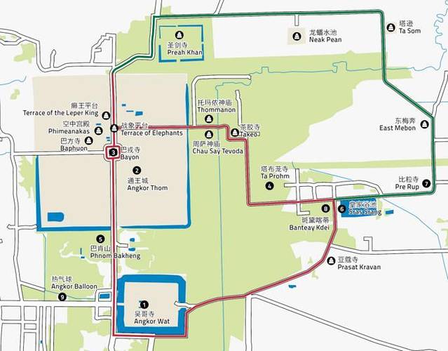 1、红线为小圈,绿线为大圈。还有外圈——班提色玛、女王宫、崩密列、罗洛寺群(神牛寺、罗莱寺、巴空寺)因为距离市区较远,而且景点分散所以图上没有标注出来。