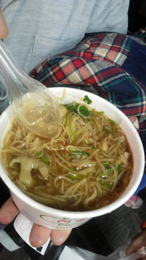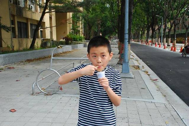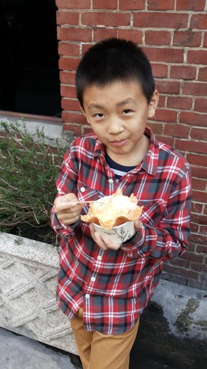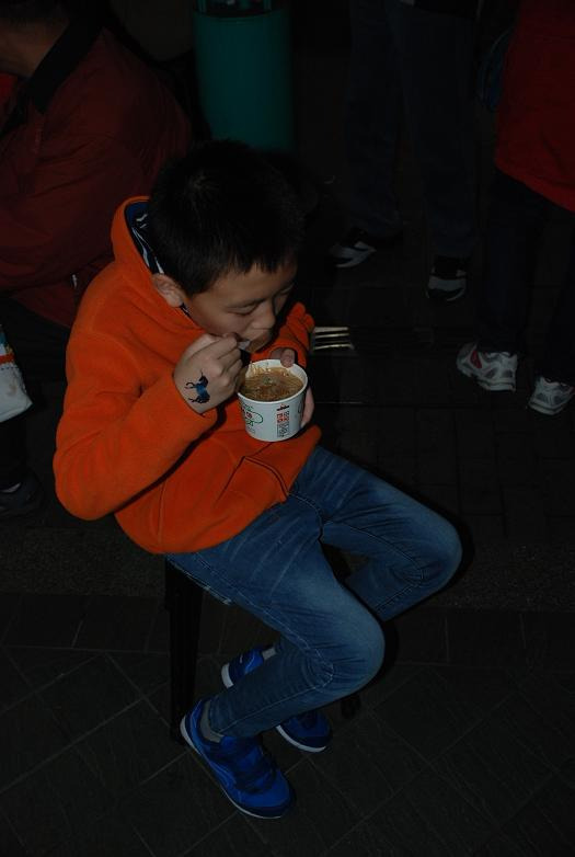 这家店顾客多,店面小,没有可供坐的桌子,食客都是站着吃的,给小朋友找到座椅,这时吃货的本质也体现出了,手捧有点烫手的纸碗,边吹边吃,还大呼好吃。